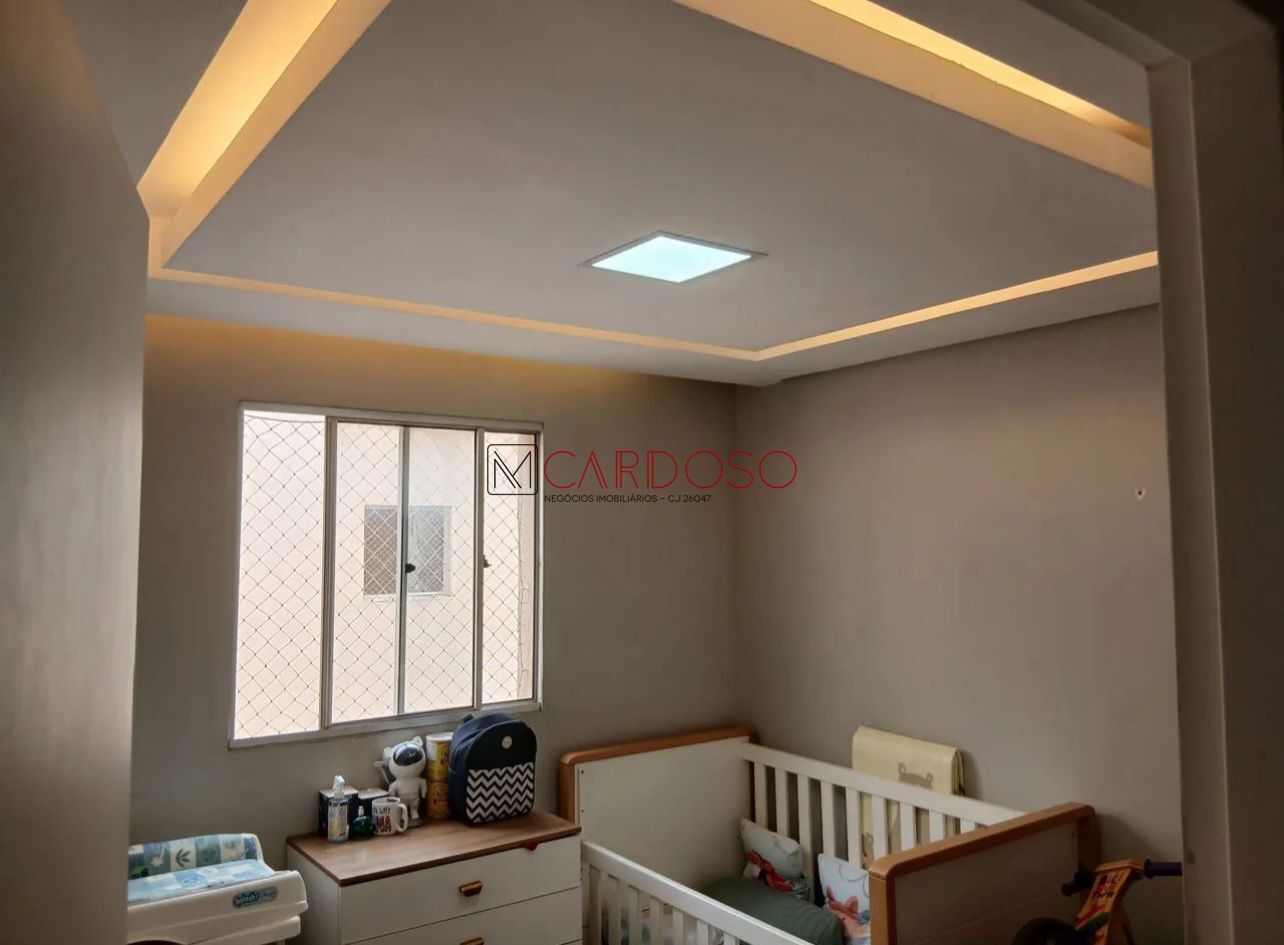 Apartamento reformado, com acabamento moderno. Possui lustre na sala, porcelanato em todos os ambientes, cozinha e banheiro com pedra de mármore e armários planejados, garantindo praticidade e sofisticação.